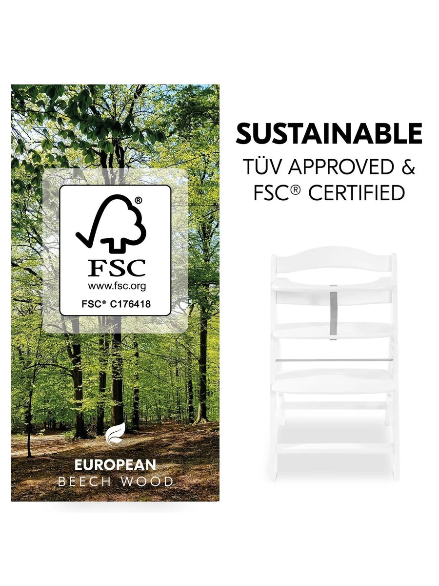The Hauck Alpha+ Premium Bundle is a complete, sustainable highchair set that grows with your child from birth to adulthood. Designed for comfort, safety, and longevity, this all-in-one bundle includes the Alpha+ Wooden Highchair, Alpha Bouncer Premium, soft padded seat insert, and convenient click-on tray. From day one, your baby can relax in the Alpha Bouncer Premium with its 5-point harness and adjustable backrest, either securely attached to the highchair or on the separate rocking base. As your little one grows, the ergonomic baby seat and padded insert ensure a snug fit, while the detachable tray offers flexible use for mealtime or play. With 8 adjustable seat and footrest positions, the Alpha+ adapts to every stage – from infant to adult. Crafted from durable, FSC®-certified beechwood, it combines timeless design with exceptional stability for years of everyday family use.