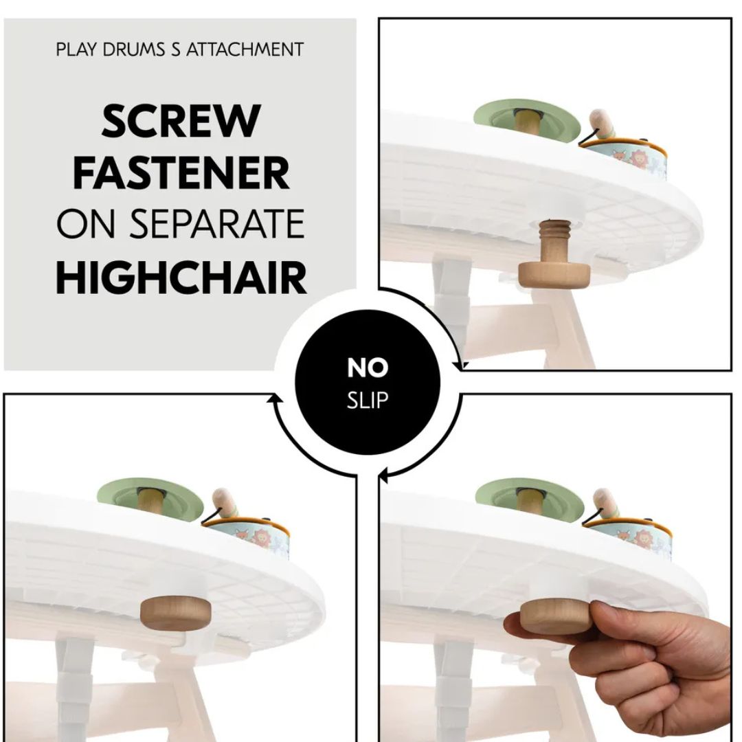 Introduce your little one to the joy of music with the Hauck Play Drums S, a carefully designed drum set for toddlers. Featuring a small drum and cymbal, it encourages early hand-eye coordination, acoustic perception and creative play from 10 months. Perfectly compatible with Alpha+, Beta+ and Arketa highchair Play Trays, the drum set is securely attached with no loose parts, keeping your child safe and engaged. The drumstick is tethered with a cord, and the set can also be used independently on the floor for versatile play. Made from sustainable FSC®-certified wood and painted with water-based, non-toxic colours, the Play Drums S is a safe, eco-friendly introduction to your child’s first musical experiences.