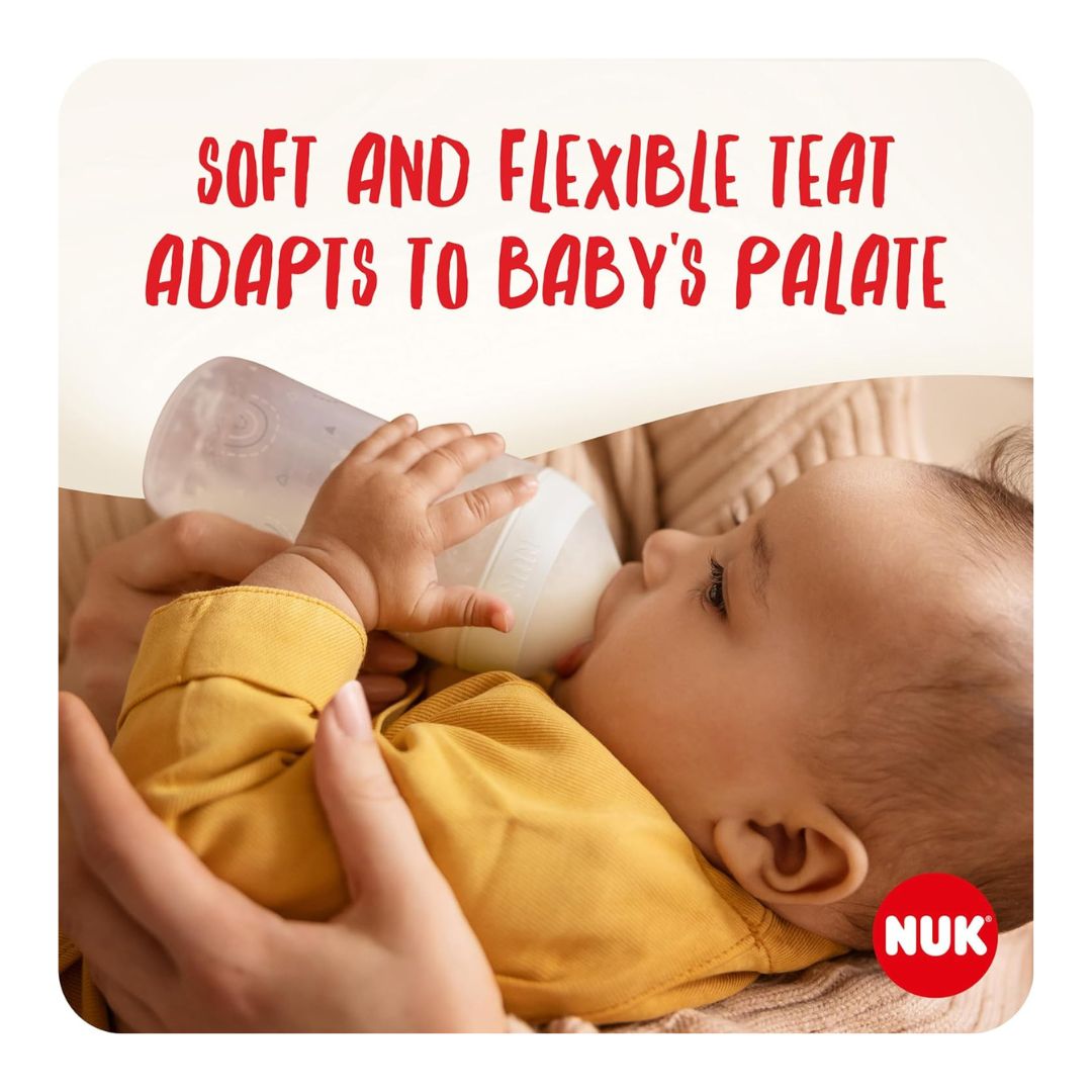 The NUK Perfect Match baby bottle is simply right for baby, thanks to its adaptive design. The bottle teat is uniquely soft and elastic, just like mum's skin, so that it gently moulds to any baby’s lips and palate. The smoothly tapering shape also makes it easy to latch on in the right way: mouth wide open with lips enclosing the teat. The Innovative Anti-Colic vent helps prevent the harmful swallowing of air, with 3 teat size options that regulate milk flow in the best way for your baby. Ensuring baby's milk is the perfect temperature is simple thanks to the built-in Temperature Control Indicator on the side of the bottle that changes colour from blue to white when the bottle's contents are too hot.*** Cleaning is also super easy thanks to the simple 4-part system that can be taken apart quickly. The NUK Space silicone soother protects your baby's sensitive skin in the best possible way, ensuring the greatest comfort at all times.