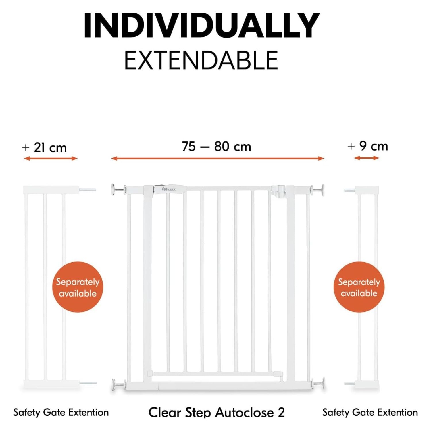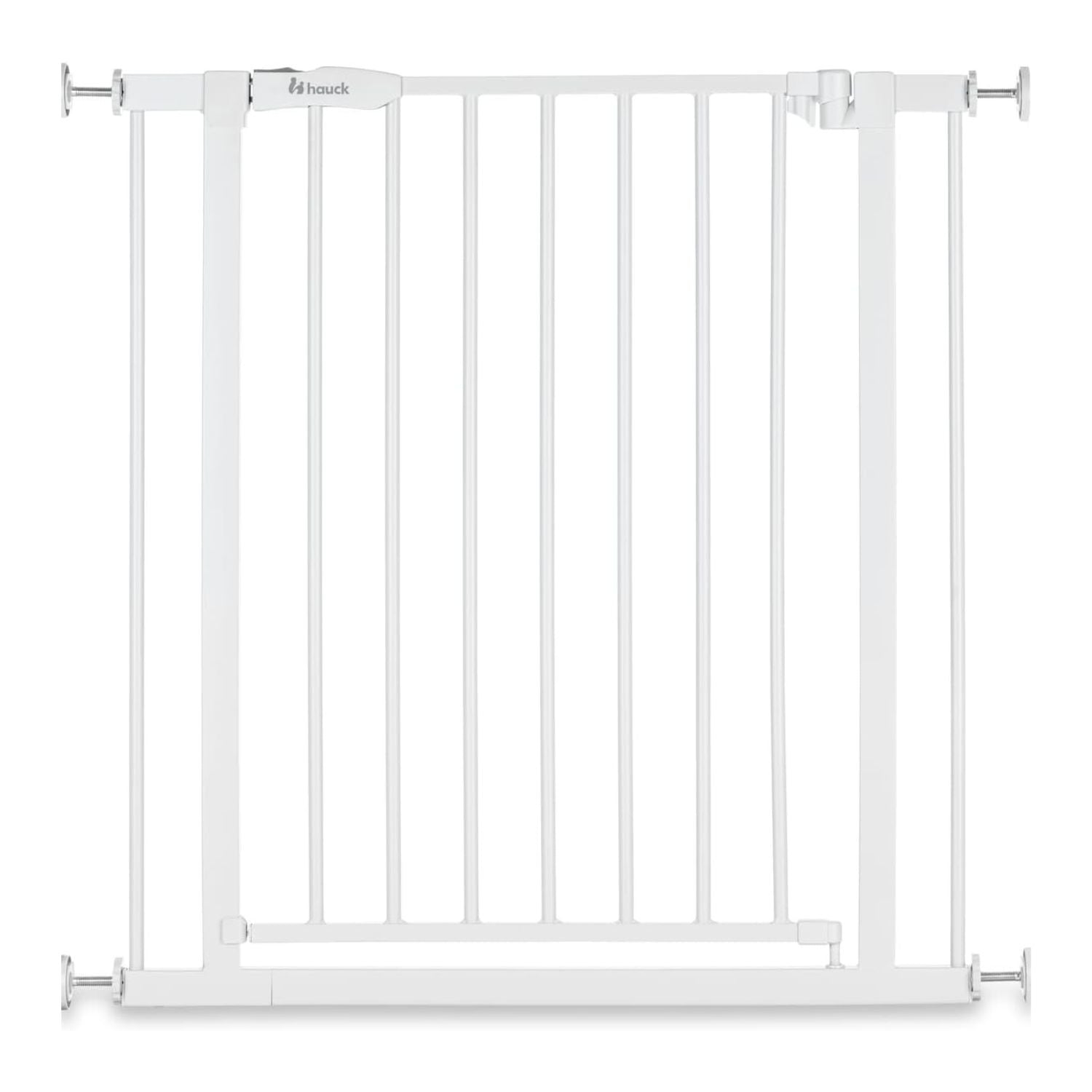 The Open N Stop 2 White is a versatile indoor baby safety gate designed to fit securely in doorways and at the top or bottom of stairs, with a width range of 75 cm to 80 cm. Its pressure-fit system ensures easy installation without the need for drilling, protecting your walls from damage. The gate is fitted using adjustable screws, creating a secure and stable barrier. It features a manual opening and closing mechanism, allowing the gate to swing open in both directions when lifted slightly, and then lock back in place effortlessly. The self-adjusting design ensures any initial gaps near the locking mechanism are eliminated as you tighten the screws. For even more flexibility, optional extensions of 9 cm and 21 cm are available separately, as well as a Y spindle attachment for installation on railings with rounded bars.