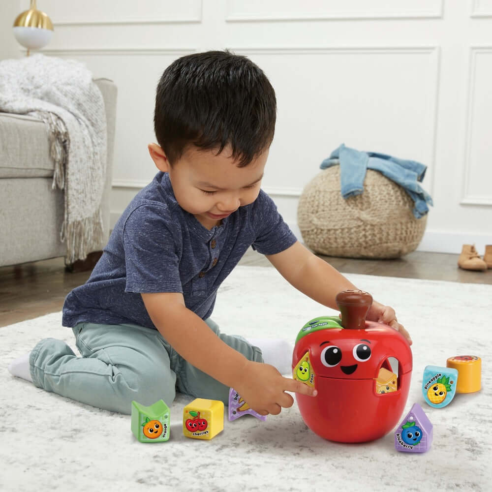 Let’s spin and sort with the Sorting Fun Apple - a new way to sort shapes! Made from 90% reclaimed plastic, this cute & chunky shape sorter apple spins at the press of its stem, spinning around to create both classic shapes and more unique shapes - go beyond square, diamond, oval and bow!