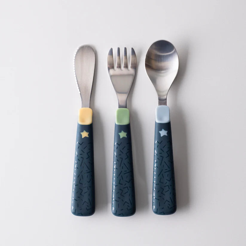 - Stainless-steel first cutlery set with rounded edges for safe, confident self-feeding.